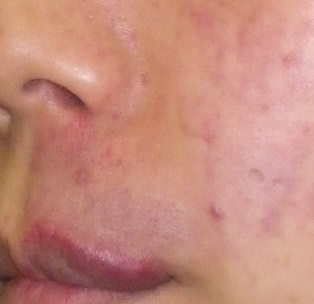 初診時、初診より2年後、3年後です。この間、3-6か月に1回、治療を続けていただいています。まだ色調は残っていますが、通常のファンデーションで対応できるようになったとのことでした。
